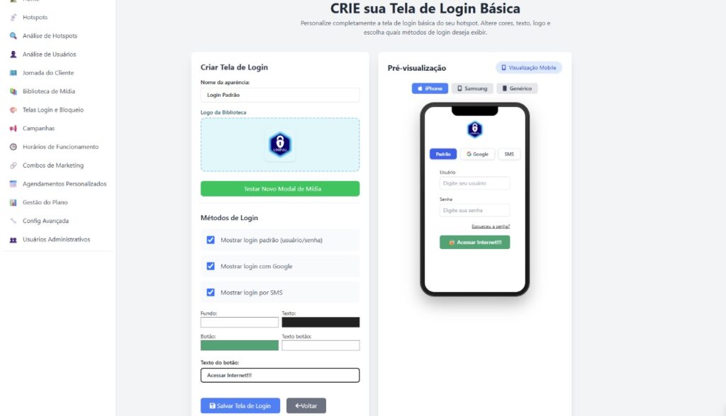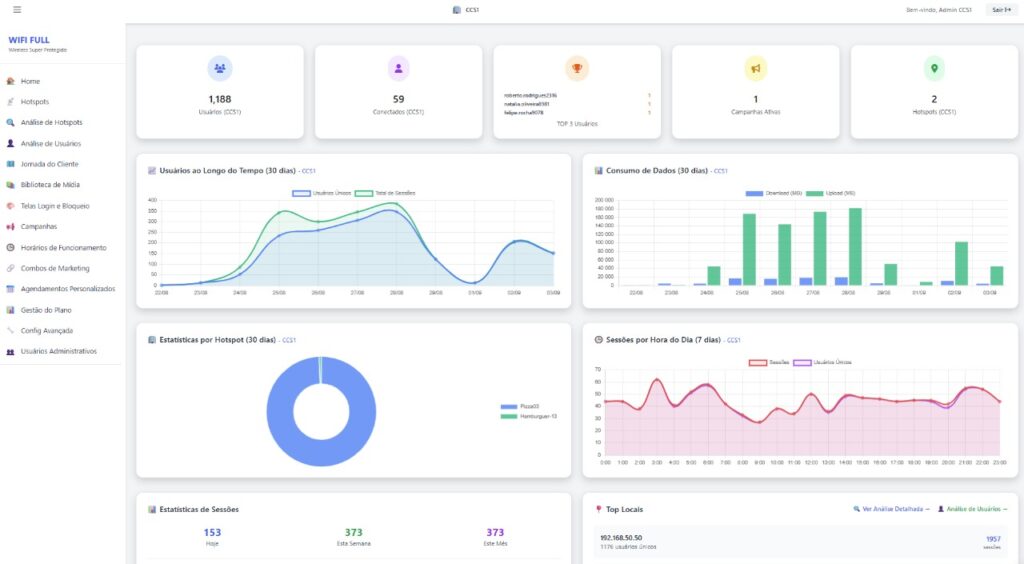 Uma única plataforma para hotspots públicos, hotéis e empresas, com autenticação RADIUS, portal de login com marketing e logs completos de NAT por portas vinculados ao usuário.