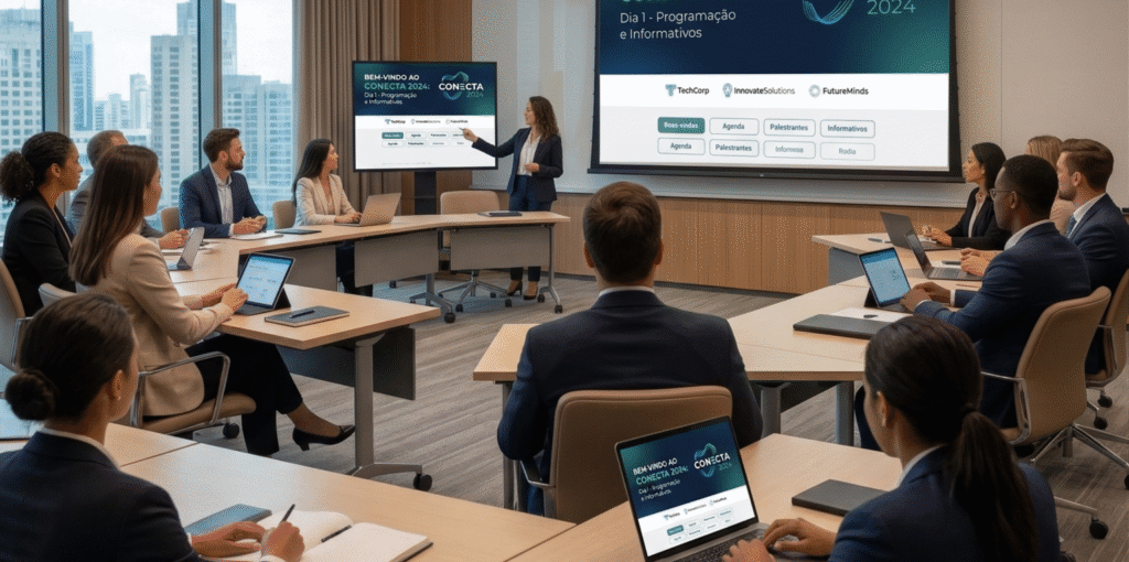 Programação, informativos, logo do evento ou patrocinador. Cada evento pode ter seu próprio portal temporário.